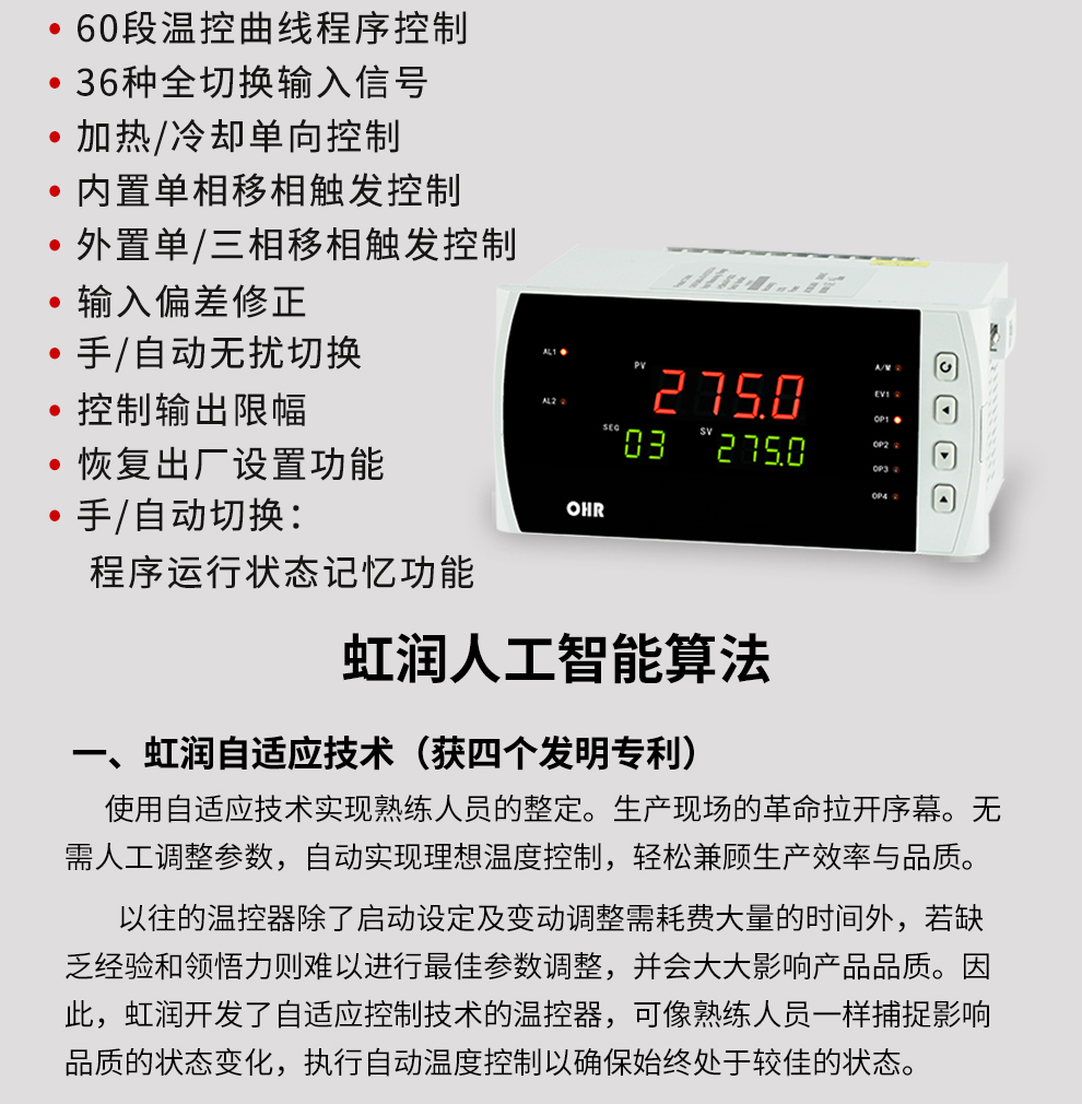 虹潤公司是專業(yè)生產(chǎn)溫控器的國家專精特新“小巨人”企業(yè)。生產(chǎn)的程序段智能溫控器,具有真正人工智能算式,無需人工整定參數(shù),控制精度可達±0.1°C,60段溫控曲線程序,無超調(diào)、欠調(diào)等特點。產(chǎn)品獲得模糊PID控制儀及控制方法、人工智能調(diào)節(jié)器、智能化控制器、移相觸發(fā)控制器、閥門自動手動無擾動操作控制方法及裝置等5項國家發(fā)明專利,主持起草智能溫度儀表通用技術(shù)條件、工業(yè)過程控制系統(tǒng)用模擬輸入兩位或多位輸出儀表、工業(yè)過程測量和控制系統(tǒng)用智能調(diào)節(jié)器等3項國家標(biāo)準,,以及通信系統(tǒng)多通道數(shù)據(jù)采集控制終端規(guī)范軍用標(biāo)準,參與國際5G標(biāo)準制定,取得60段PID自整定調(diào)節(jié)器等3項相關(guān)軟件著作權(quán)。產(chǎn)品廣泛應(yīng)用于電力、石化,冶金、制藥、食品等幾乎所有工業(yè)現(xiàn)場,實現(xiàn)精準控溫,保障生產(chǎn)安全與質(zhì)量。