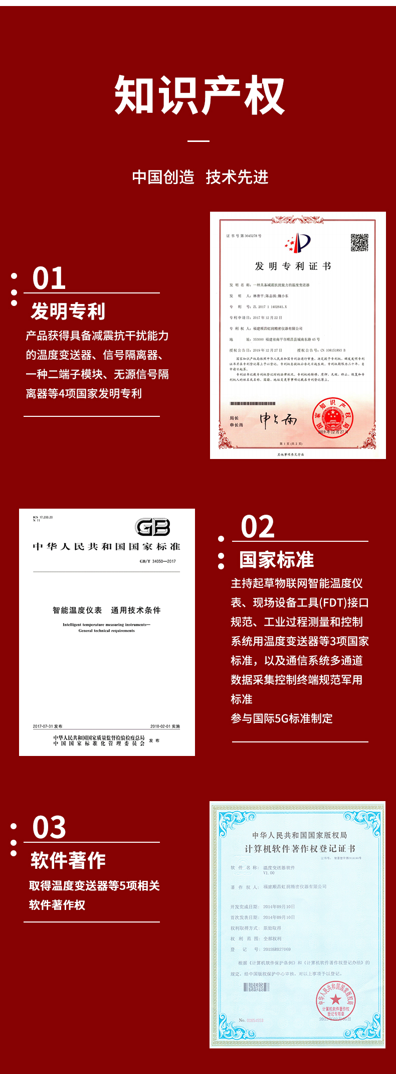 虹潤公司是專業(yè)生產(chǎn)溫度變送器的國家專精特新“小巨人”企業(yè)。生產(chǎn)的溫度變送器,具有采用磁隔離技術(shù),配套編程器可修改參數(shù),抗干擾能力強(qiáng),穩(wěn)定性好,帶RS485或HART通訊等特點(diǎn)。該產(chǎn)品不僅通過HART基金會(huì)認(rèn)證、德國萊茵 CE 認(rèn)證與 SIL 功能安全認(rèn)證,還獲得具備減震抗干擾能力的溫度變送器、信號(hào)隔離器、一種二端子模塊、無源信號(hào)隔離器等4項(xiàng)國家發(fā)明專利,主持起草物聯(lián)網(wǎng)智能溫度儀表、現(xiàn)場(chǎng)設(shè)備工具(FDT)接口規(guī)范、工業(yè)過程測(cè)量和控制系統(tǒng)用溫度變送器等3項(xiàng)國家標(biāo)準(zhǔn),以及通信系統(tǒng)多通道數(shù)據(jù)采集控制終端規(guī)范軍用標(biāo)準(zhǔn),參與國際5G標(biāo)準(zhǔn)制定,取得溫度變送器等5項(xiàng)相關(guān)軟件著作權(quán)。產(chǎn)品廣泛應(yīng)用于石油、電力、化工,冶金、制藥、紡織、橡膠制造等工業(yè)領(lǐng)域現(xiàn)場(chǎng)自動(dòng)化測(cè)溫過程。