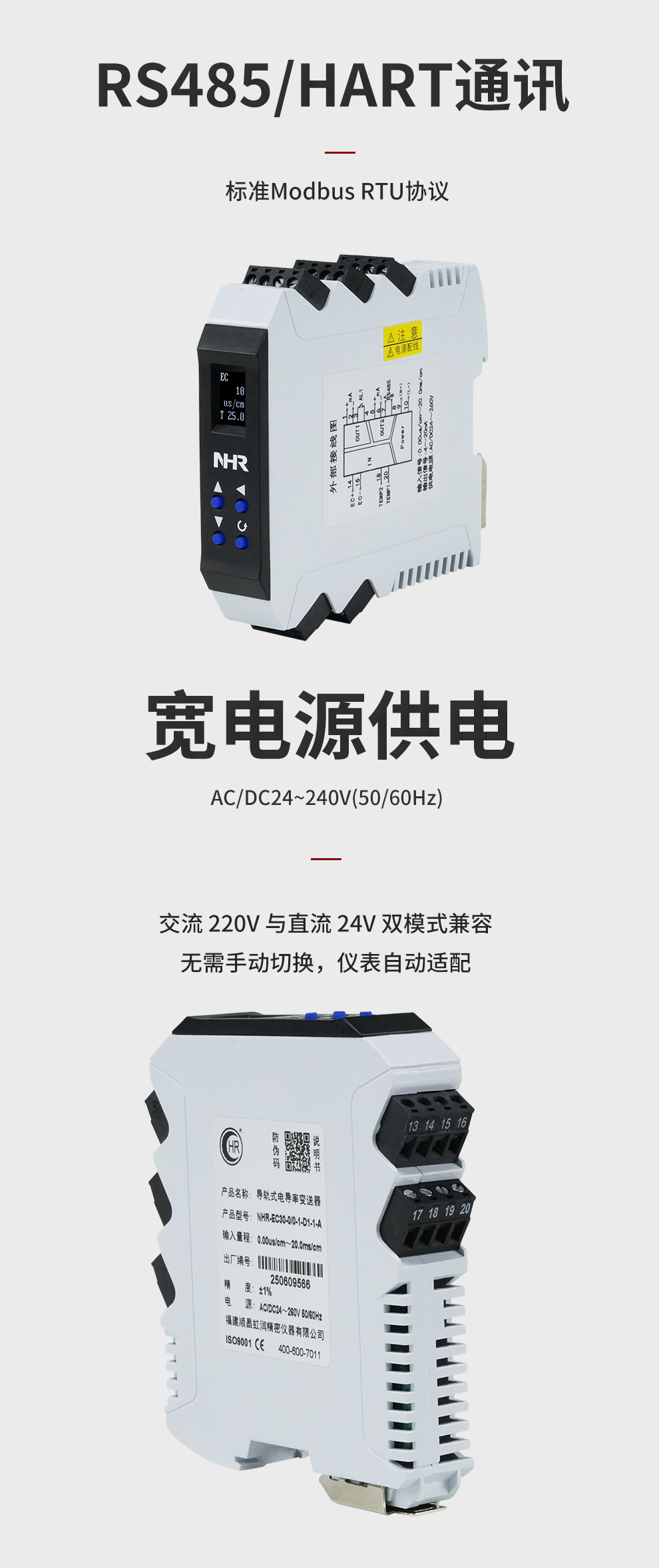虹潤公司是專業(yè)生產(chǎn)水質(zhì)分析儀的國家專精特新“小巨人”企業(yè)。生產(chǎn)的導(dǎo)軌式電導(dǎo)率變送器,具有測量穩(wěn)定不跳字,液晶顯示按鍵操控,變送輸出精準(zhǔn),寬范圍電源供電,RS485或HART通訊等特點(diǎn)。產(chǎn)品獲得一種信號發(fā)生裝置、智能化控制器等2項國家發(fā)明專利;主持起草現(xiàn)場設(shè)備集成等5項智能制造國家標(biāo)準(zhǔn),以及現(xiàn)場設(shè)備工具(FDT)接口規(guī)范、工業(yè)過程控制系統(tǒng)用模擬輸入兩位或多位輸出儀表、過程分析技術(shù)系統(tǒng)等3項國家標(biāo)準(zhǔn);參與國際5G標(biāo)準(zhǔn)制定,取得導(dǎo)軌電導(dǎo)率變送器等3項相關(guān)軟件著作權(quán)。產(chǎn)品廣泛應(yīng)用于實驗室、水處理、環(huán)境監(jiān)測、制藥、食品、農(nóng)業(yè)、工業(yè)流程控制等諸多領(lǐng)域。