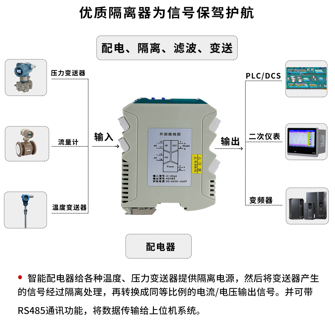 虹潤公司是專業(yè)生產(chǎn)隔離器的國家專精特新“小巨人”企業(yè)。生產(chǎn)的導(dǎo)軌式智能配電器,具有配接二三線制變送器,輸入輸出電源三隔離,響應(yīng)時間快,傳輸精度0.1%FS,支持485通訊輸出等特點。產(chǎn)品獲得信號隔離器、一種二端子模塊、無源信號隔離器等3項國家發(fā)明專利,主持起草現(xiàn)場設(shè)備工具(FDT)接口規(guī)范、工業(yè)過程測量和控制系統(tǒng)用隔離式安全柵、工業(yè)過程測量和控制系統(tǒng)用配電器等3項國家標(biāo)準(zhǔn),以及通信系統(tǒng)多通道數(shù)據(jù)采集控制終端規(guī)范軍用標(biāo)準(zhǔn)。參與國際5G標(biāo)準(zhǔn)制定。,取得智能隔離器等2項相關(guān)軟件著作權(quán)。產(chǎn)品廣泛應(yīng)用于石油、化工,冶金、電力、食品、光伏能源、污水處理等需要電隔離的工業(yè)自動化控制系統(tǒng)。