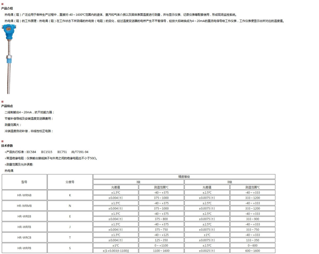 帶溫度變送器熱電偶(阻),由基準(zhǔn)源、冷端補(bǔ)償、放大單元、線性化處理、V/I轉(zhuǎn)換、斷偶處理、反接保護(hù)、限流保護(hù)等電路單元組成。它是將熱電偶(阻)產(chǎn)生的熱電勢(shì)經(jīng)冷端補(bǔ)償放大后,再帽由線性電路消除熱電勢(shì)與溫度的非線性誤差,最后放大轉(zhuǎn)換為4~20mA電流輸出信號(hào)。
