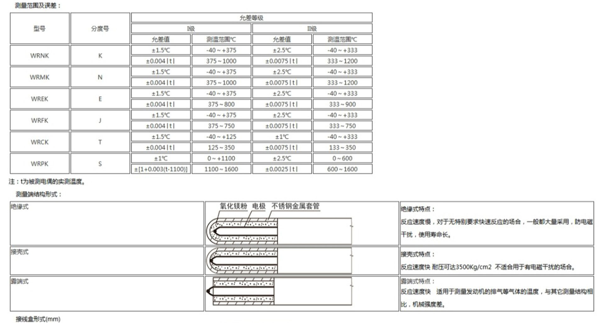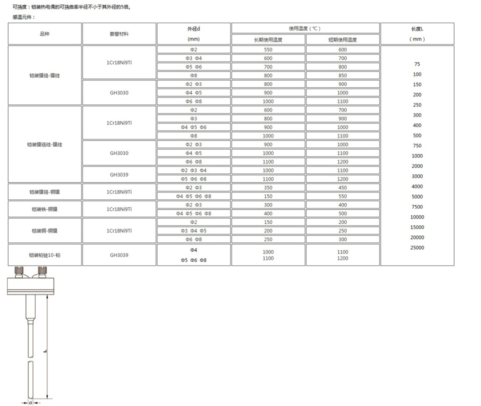 鎧裝熱電偶作為溫度測量傳感器,通常與溫度變送器、調節(jié)器及顯示儀表等配套使用,組成過程控制系統(tǒng),用以直接測量或控制各種生產(chǎn)過程中0-1800℃范圍內的流體、蒸汽和氣體介質以及固體表面等溫度。鎧狀熱電偶具有能彎曲、耐高壓、熱響應時間快和堅固耐用等許多優(yōu)點。