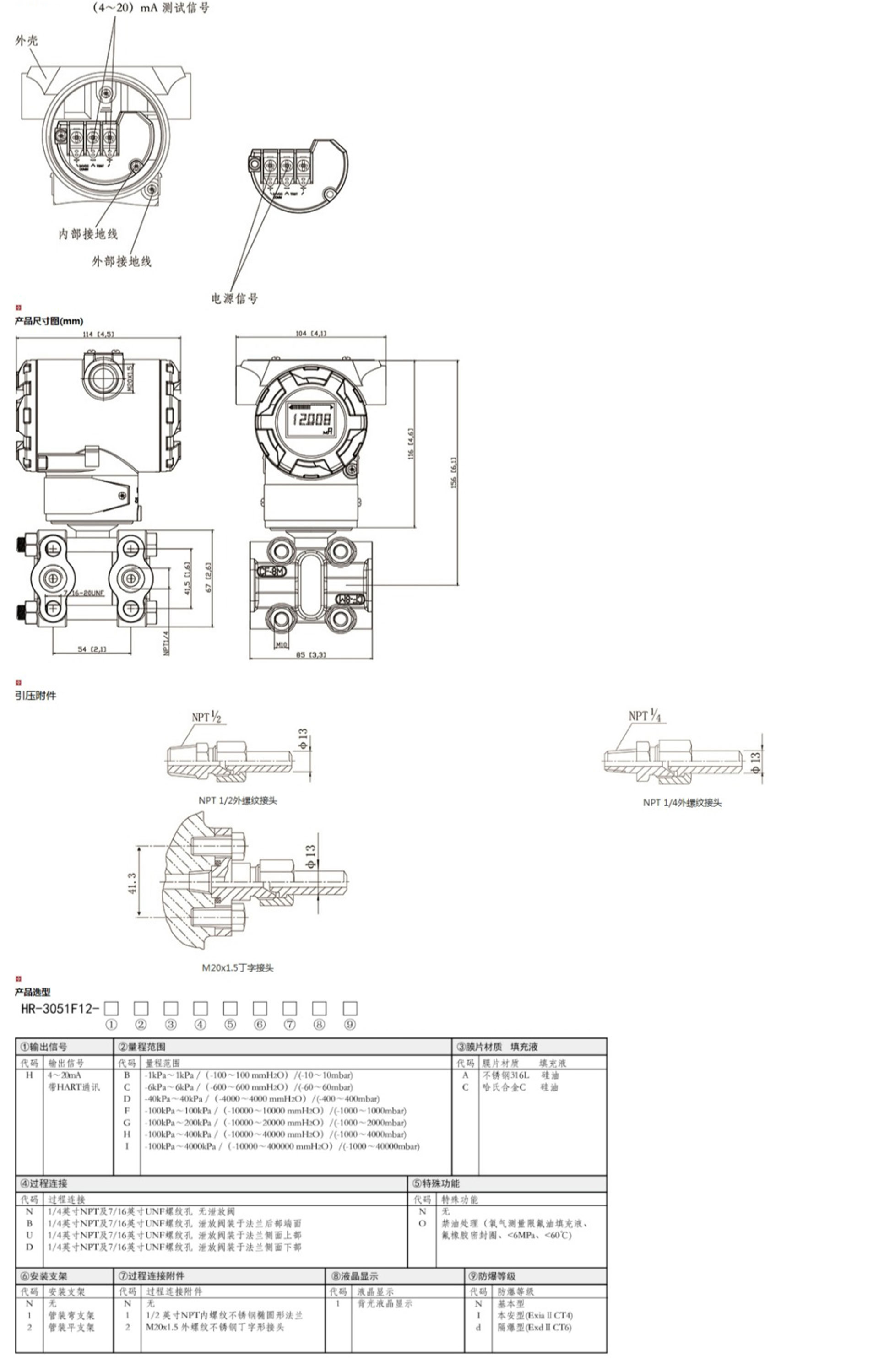 HR-3051F12智能單晶硅夾板式壓力變送器能準(zhǔn)確的測(cè)量壓力,并把它轉(zhuǎn)換成4~20mADC的輸出信號(hào)。該變送器可通過(guò)三按鍵本地操作,或通用手操器、組態(tài)軟件、以及手機(jī)APP遠(yuǎn)程操作,在不影響4~20mA DC的輸出信號(hào)的同時(shí),進(jìn)行顯示與組態(tài)。