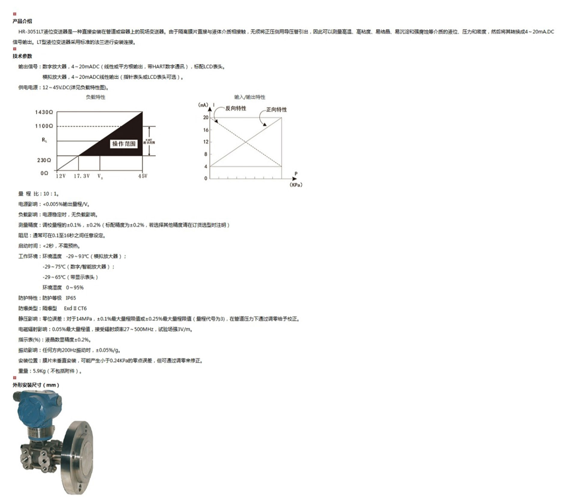 HR-3051LT液位變送器是一種直接安裝在管道或容器上的現(xiàn)場變送器。由于隔離膜片直接與液體介質(zhì)相接觸,無須將正壓側(cè)用導(dǎo)壓管引出,因此可以測(cè)量高溫、高粘度、易結(jié)晶、易沉淀和強(qiáng)腐蝕等介質(zhì)的液位、壓力和密度,然后將其轉(zhuǎn)換成4~20mA.DC信號(hào)輸出。